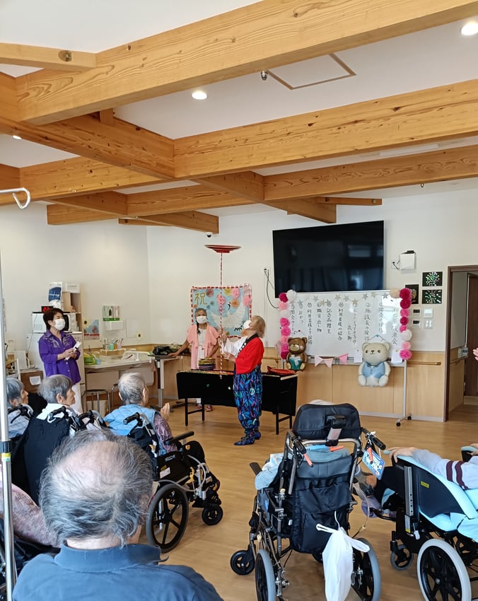 本日は敬老会でした。ボランティアの方々にお越しいただき、南京玉すだれ、皿回し、マジックを披露していただきました。目の前で繰り広げられる素晴らしい演目に利用者様は大きな拍手と歓声を送られていました。
